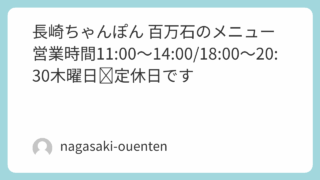 長崎ちゃんぽん 百万石のメニュー営業時間11:00〜14:00/18:00〜20:30木曜日 定休日です